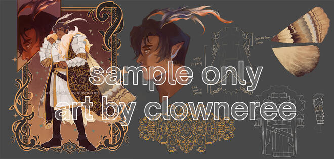 ✦ Custom designs (also termed as "Character Designs" and "Designs") by clowneree include custom character design commissions, adoptable designs and closed species designs.✦ DESIGNS ARE ONLY FOR PERSONAL USE. If you'd like to use it commercially, please send discuss with me.✦ Additional fees are added for the following: FFXIV characters, Genshin/Mihoyo characters, closed species, and characters that I may consider complex. Fees may vary from $5.00 to $20.00 depending on the commission type, so please make sure to read through the final quotation before we start!✦ You acknowledge that the design is only a DIGITAL ITEM and does not require shipping.✦ You acknowledge that you, the buyer, confirmed that you WILL pay for the digital item and may not claim a chargeback or report for an unshipped physical item.✦ You acknowledge that you agreed and will pay within the set timeline. Failure to do so will result in the design being put up for re-sale.✦ You may not resell the design without notifying the artist. You may not resell the design at a higher price than what it was originally bought for.✦ You may resell the design at its original price + the cost of extra commissions, if there are any.✦ DO NOT CLAIM THE DESIGN AS YOUR OWN. You can commission artwork of this design. You may not copy this design and pass it off as your own. Original designer credits to clowneree must be retained.✦ A redesign may be done based on the original custom design as long as the original artwork is not edited.✦ In addition, you may not edit the original image (i.e. recolors) or use it as a base. Recolors may be requested from clowneree, but will result in additional fees.✦ Premade character designs / adoptables by clowneree may be the basis of a design for an existing closed species, but there will be extra fees if the buyer does not own the species. The design may not be used to create a new closed species. The original artwork made by clowneree must not be edited. The buyer may create or commission a new artwork with the closed species edit based on the original artwork by clowneree. The original designer credit to clowneree must be retained.✦ You can use the png/artwork (even the version with no watermark) the artist has created for a new reference sheet, but the artist (clowneree) must be credited.✦ When posting on social media (twitter, discord, etc.), please use the version with a watermark.✦ FOR TOYHOU.SE users: The artist will transfer ownership of the character to the client once payment is completed.✦ The client may not use the design for NFT or for Gen AI.